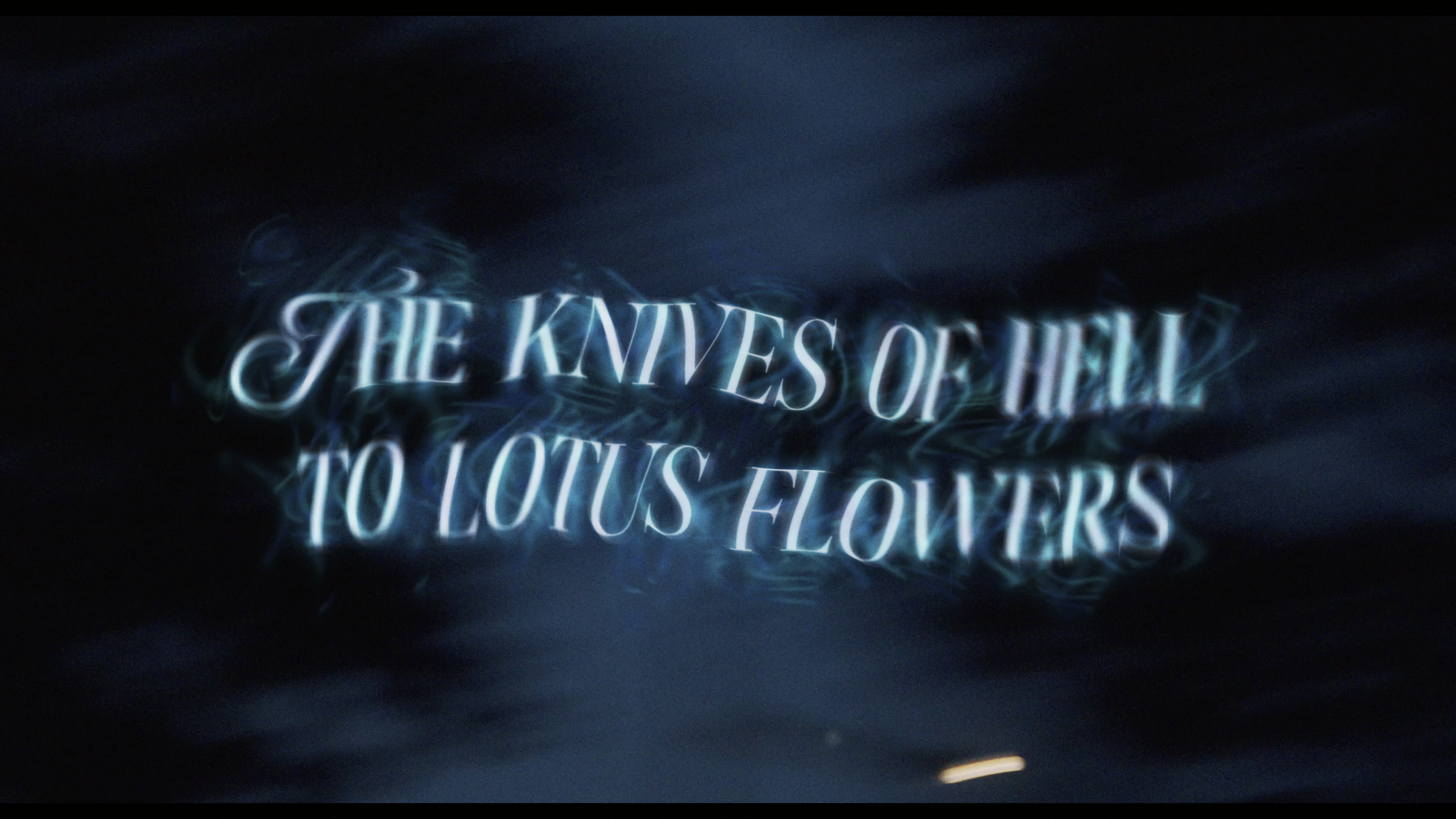 The knives of hell to lotus flowers encapsulates a duality between daily sufferings represented by the knives, contrasted with the potentiality of rebirth symbolised by the lotus flowers, known for their ability to grow in the mud after extended periods of dormancy.